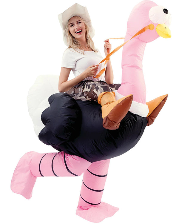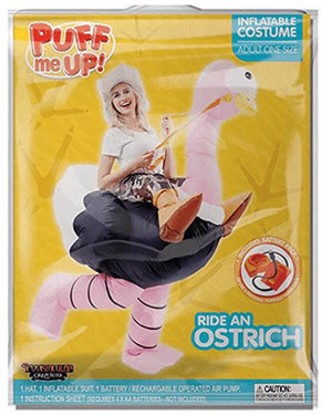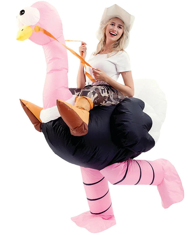 with this Riding An Ostrich Inflatable Adult Costume. The costume comes as an inflatable costume that is worn like pants to make it look like your child's feet are the ostrich's feet. Part of the costume is two faux legs that sit at the waist and straddle the ostrich to make it look like it's being ridden with orange reigns at the ostrich's beak to hold the neck upright. The costume comes complete with a hat. Just slip your legs through the ostrich leg, adjust the direction of the fan and tighten the drawstrings for easy inflation. Great as a teacher's Book Week costume.