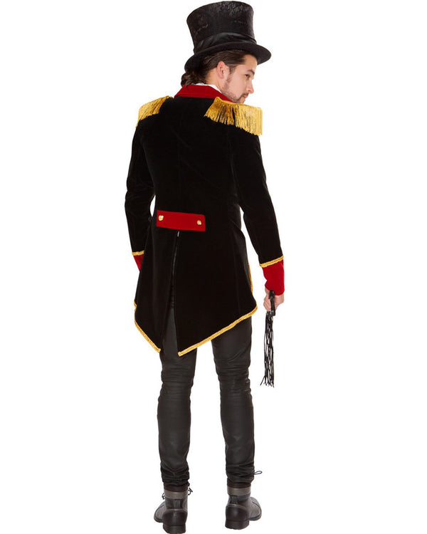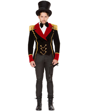 You'll be welcoming the crowd to the greatest show on earth in this Ringmaster Mens Costume. This authentic looking costume features a black tailed jacket with gold button and chain detailing as well as shoulder pads with gold fringing. The included black bow tie and whip will help you get into character. Simply add a black top hat, pants and shoes to complete the look.