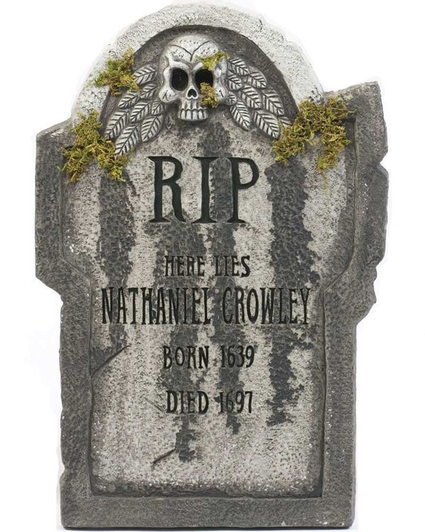 If you want to turn your venue into a graveyard then be sure to pick up this RIP Nat Crowley Tombstone 55cm The tombstone features a skull with leaves and faux moss along with the words 'RIP here lies Nathaniel Crowley born 1639 died 1697'. The tombstone also comes with yard stakes and measures 55cm tall.