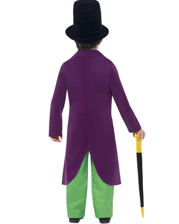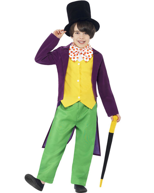Have some dress up fun with this Roald Dahl Wonka Boys Costume, depicting the costume worn by Willy Wonka, the famous owner of a certain chocolate factory! The outfit features a yellow waistcoat top with an attached tailed jacket in deep purple. Bright green pants, a spotted bow tie and soft black top hat are also included. A soft cane adds the final touch!