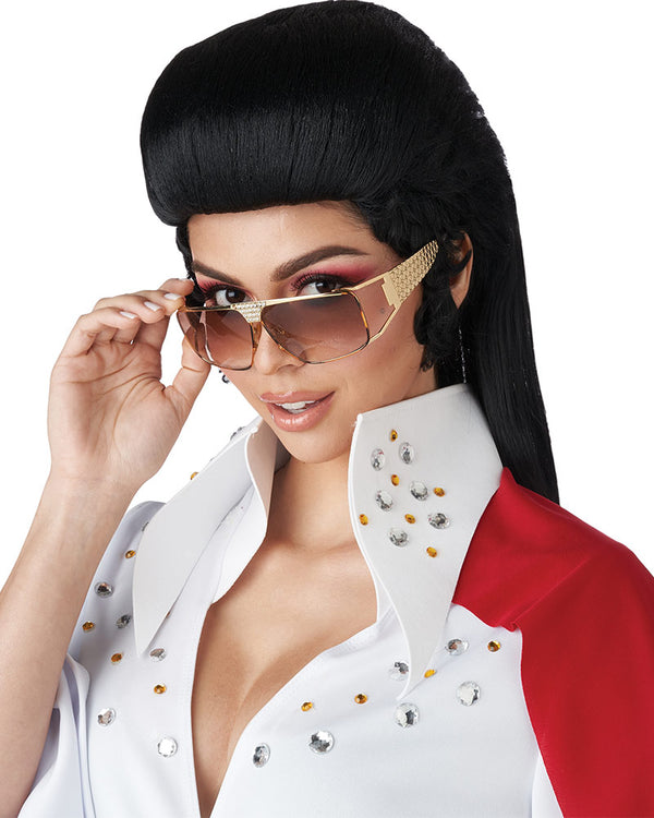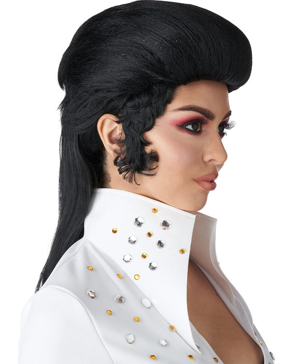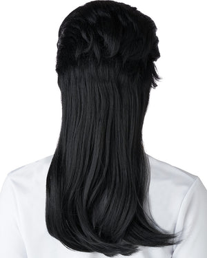 Transform into the famous Elvis Presley with this fantastic Rock n Roll Royalty Long Black Wig. The wig is black and long and designed in a mullet style with big curly sideburns - just like the king himself. Wear a wig cap for added comfort and to keep your own hair under wraps.