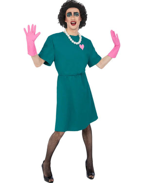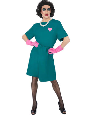 Have your guests shiver, with antici....pation as you dress for surgery wearing this Rocky Horror Show Frank N Furter Surgical Mens Costume. This monster-creating costume comes complete with a teal knee-length gown with short sleeves and a small light pink heart on the chest. A pair of light pink gloves that not only accessories but shows your professionalism with a touch of fabulousness. For true Frank N Furter style, wrap the included oversized white pearl necklace. Based on the cult classic 1975 film Rocky Horror Picture Show, this costume is guaranteed to give you an insatiable desire to sing 'Sweet Transvestite' all night long.