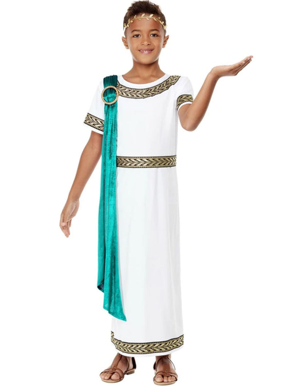 The chariot awaits when you wear this Roman Empire Emperor Boys Costume. The costume includes a white toga with gold print detailing on the collar, waist, sleeves and hem as well as a blue velvet look cloth attached to one shoulder.
