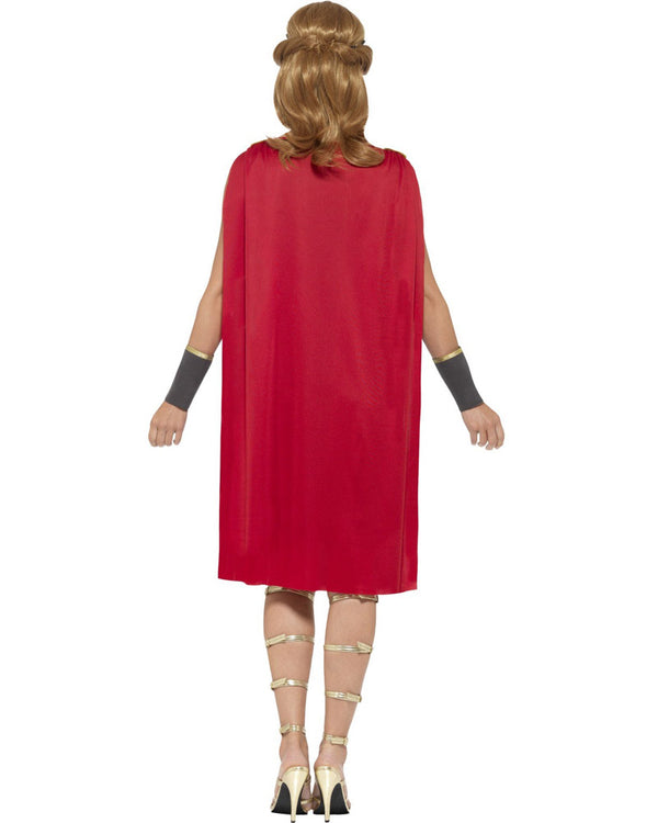 Walk into the Colosseum like you own the place in this Roman Warrior Womens Costume. The costume features a black dress with a brown overlay printed with gold embellishments and an attached red cape. Two matching arm cuffs with gold trim are also included along with a headband to complete the look.