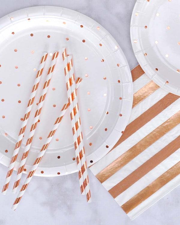 Create a stylish celebration with these Rose Gold Stripes and Dots Lunch Napkins. The napkins come in a pack of 20 with small rose gold dots on one side and light and dark rose gold stripes on the other. Match with the rest of our Rose Gold and Rose Gold Floral range for a coordinated look.