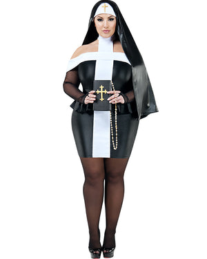 Devote yourself to the church while wearing our Sacrilege Sister Womens Plus Size Costume. Featuring a short black off the shoulder dress with long black sleeves with a ruffled hem along the bodice and styled with a white cross that extends around the shoulder and up to the neckline. Also included is a black clutch with a gold Holy Cross stitched on the front, resembling a bible, and a gold, pearl detailed strap resembling rosary beads. Of course, the costume features a long black veil with a white top section styled with the holy cross!