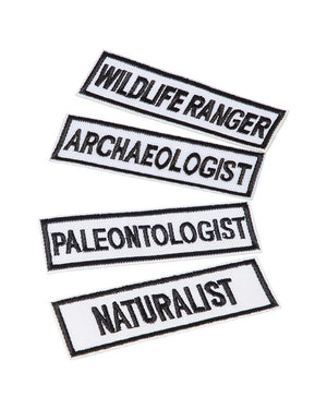 - Set of 4 embroidered name tags with the titles Paleontologist, Archaeologist, Wildlife ranger, and Naturalist for customization.