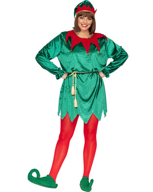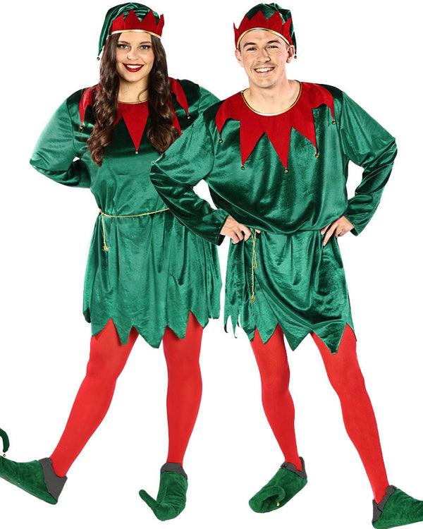 Let your heart be light with this Santas Favourite Elf Adult Costume. Included is a long-sleeve elf tunic in a luxurious pine green velour fabric, with a gold rope belt, bright red leggings, elf shoe covers with attached bells, and a matching elf hat. This unisex, easy-fit tunic looks great on everybody. It has an attached red collar with gold bells and gold trim, coordinating perfectly with a similar design on the hat. You'll look picture-perfect as Santa's favourite helper in this fabulously festive costume. Just add your lovely elf self and you're ready to party! From now on, our troubles will be out of sight.
