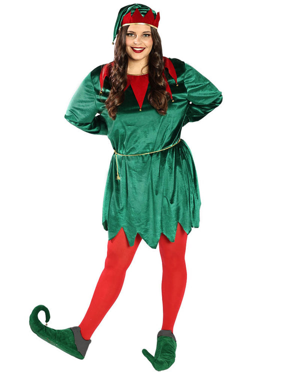 It's the best time of the year with this Santas Favourite Elf Adult Plus Size Costume. Included is a long-sleeve elf tunic in a luxurious pine green velour fabric, with a gold rope belt, bright red leggings, elf shoe covers with attached bells, and a matching elf hat. Tunic has an attached red collar with gold bells and gold trim, coordinating perfectly with a similar design on the hat. You'll look picture-perfect as Santa's favourite helper in this delightful Christmas costume. Just add your lovely elf self and you'll be ready for anything this silly season. Oh by golly, have a holly jolly Christmas–this year!