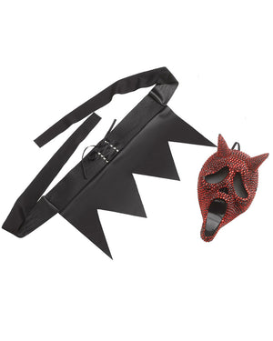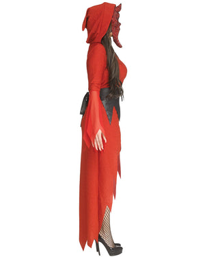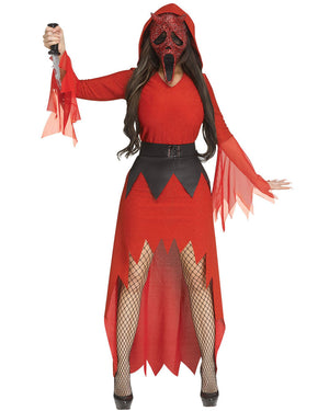 This Scream Ghost Face Lives Bling Devil Womens Costume is a devilish twist on a classic horror character. Featuring a sparkly red long sleeve, hooded dress with zig-zag tatter trim, the dress is a high-low design – short in the front, long in the back, to add interest and detail. At the waist is a black faux leather belt with eyelets, laces and matching zig-zag tatter trim. To top off the look, included is a Scream Ghost Face devil-inspired mask with ruby red rhinestones for a touch of bling. No angels here, wear yours to Halloween or movie themed parties.