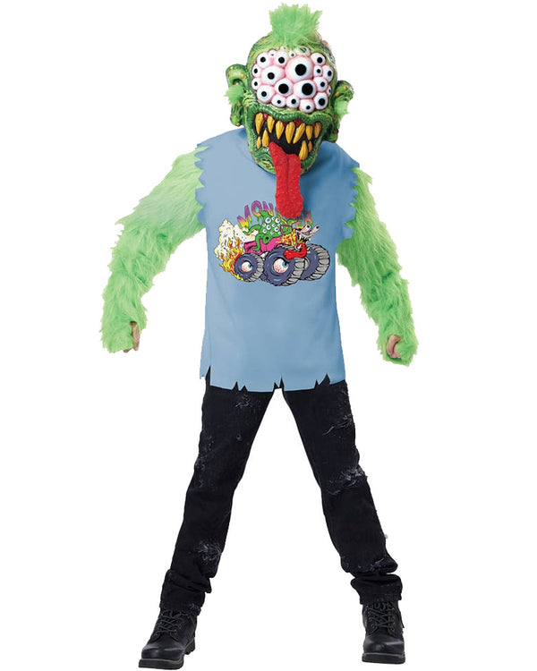 You'll have all eyes on you when you wear this See Monster Boys Costume. The costume includes a blue sleeveless singlet with jaggered hemlines and an image of a truck filled with monsters on the front. Also included is a green furry padded undershirt as well as a terrifying monster mask with big teeth, long red tongue and lots of eyes.