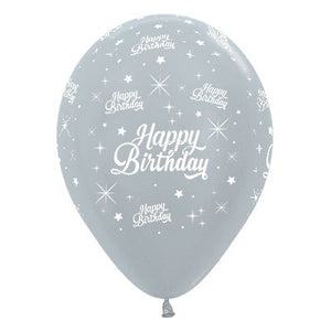 Sempertex 30cm Happy Birthday Twinkling Stars Satin Pearl Silver Latex Balloons 25PK Pack of 25