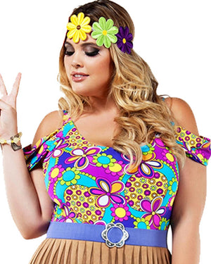Sit back wearing this Sexy Hippie Plus Size Womens Costume with your mates in the back of the kombi van listening to some tunes, while the birds chirp in the distance. Have wanderlust on your mind when you step out in this Hippy costume. This groovy costume comes complete with a dress with an off the shoulder colourful psychedelic design and a tan skirt with long tan fringing draped on over the top. A purple waist belt with a silver bucket and a headband with large colourful flowers attached. So, whether you're travelling along the open road to spread love with your friends or heading to a 60s themed party, nothing says flamboyant hippie like this radiant costume. Celebrate peace, man.