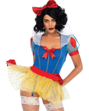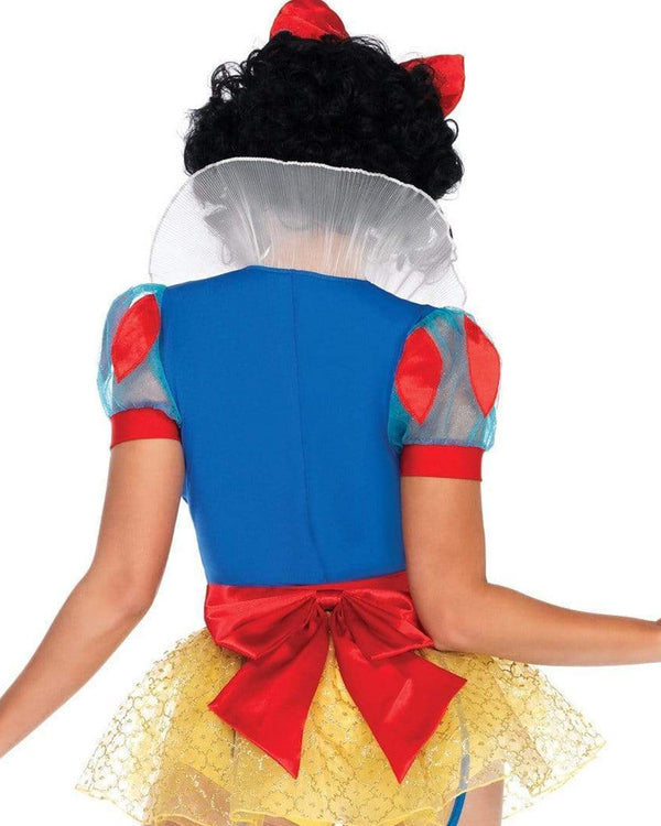 This Sexy Miss Snow Womens Costume will have you feeling like the sexiest of them all. This stunning costume comes with a blue and yellow romper with short blue tulle puff sleeves with red cuffs, an attached upturned white collar, large red bow attached to the sweetheart neckline. There is an included yellow glitter garter skirt with a red waistband and attached blue garter and a red headband with an oversized bow attached.