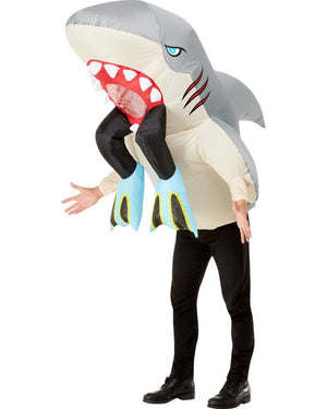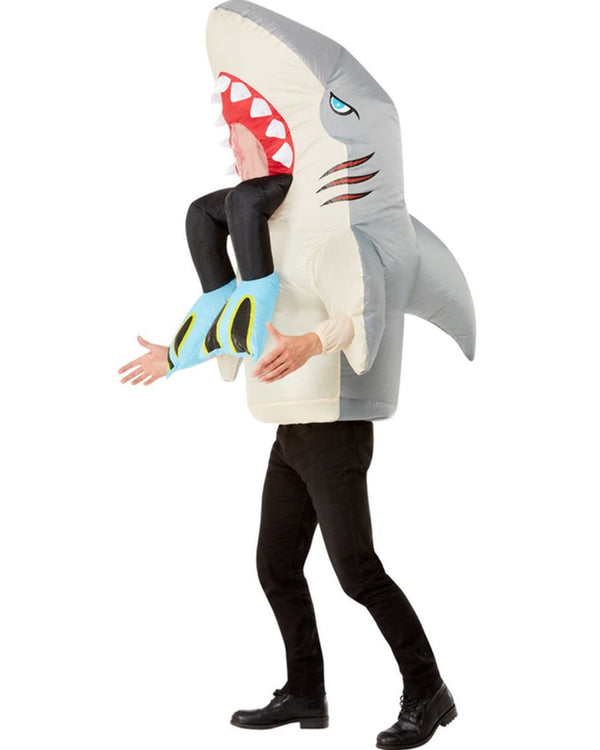 Bring a sense of humour to your next under the sea party and wear this hilarious Shark and Diver Inflatable Adult Costume. This costume comes with an inflatable top. The costume comes in the shape of a grey angry shark with its red open mouth and rows of white teeth. Popping out of the shark's mouth is a pair of black diver legs wearing a pair of blue flippers. For you to be able to see when wearing this costume, there is a clear window inside the mouth.