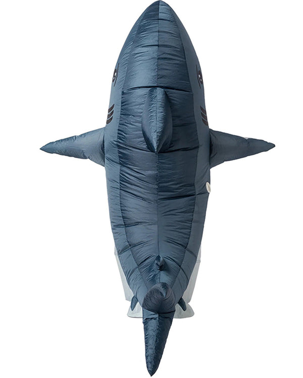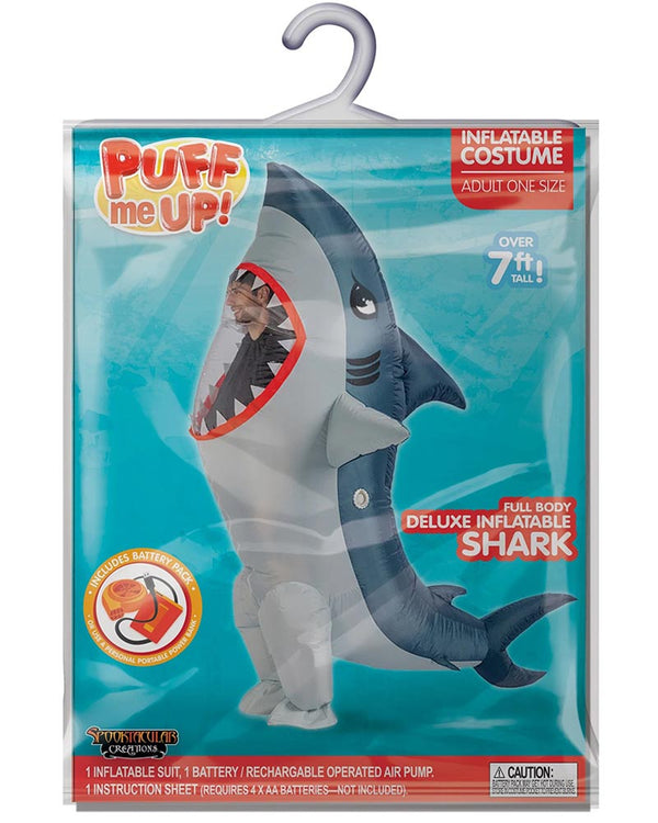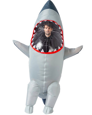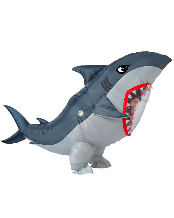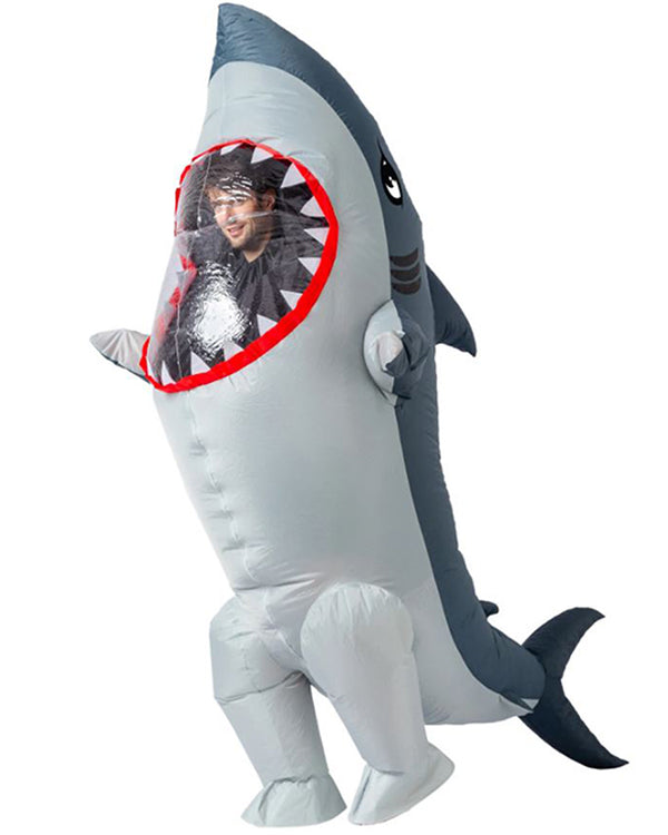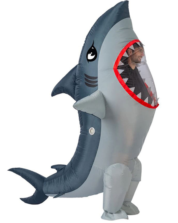 Any shark lovers would love our Shark Inflatable Adult Costume. Featuring a full-body shark inflatable styled with a long inflatable tail, printed gills, a pointy nose, inflated fins, a wide-open jaw with an array of white pointy teeth, and with a dark grey and light grey finish. In the grasp of the shark's jaws is a large clear window for your own easy visibility. In addition, the costume comes complete with an attached air pump. To wear, just simply step into the costume, adjust the direction of the fan, and tighten the drawstrings for easy inflation. You'll be ready to feast on your prey in no time.
