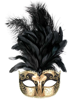 Don this beautiful Sienna Black and Gold Feathered Masquerade Mask to go out to your Masquerade ball or glamorous party. This black and gold moulded plastic mask has intricate glitter detail with black feathers. Ties at the back with thin satin ribbons. Very dramatic!