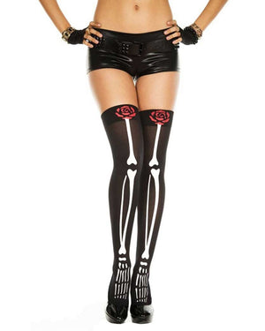 Skeleton and Rose Print Opaque Thigh High Stockings