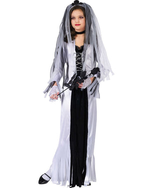 This Skeleton Bride Girls Costume is a Halloween favourite. The costume includes a tattered white and black gown with lace-up bodice and tulle trimmed cuffs, black lace choker, tulle veil headpiece and white lace fingerless gloves.