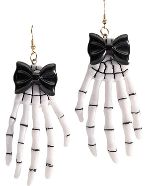 Add the perfect finishing touch to your costume with these Skeleton Hand Earrings. These earrings feature skeleton hands dangling down with black bow details.