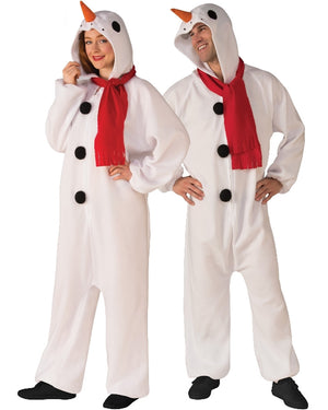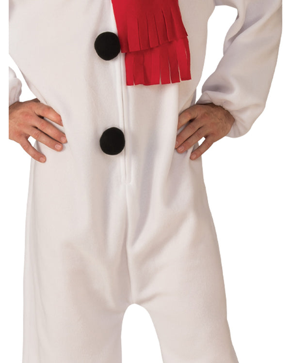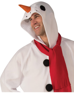 You'll be cute as a Christmas snowflake in this Snowman Jumpsuit Adult Costume. The costume includes a full length plush white hooded jumpsuit with front zipper closure. Attached to the hood is a 3D carrot nose and facial features, as well as three black pom poms attached to the front of the jumpsuit. To complete the look, also included is a red scarf.