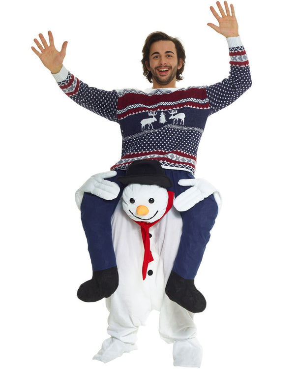 Whether you're going to a Christmas in July party or it's late December, this Snowman Piggyback Mens Costume is sure to be a hit. The costume features a pair of Piggyback pants designed to look like you are being carried by an adorable snowman. The pants feature faux legs that hang over his shoulders. The snowman features a red scarf, black hat and a carrot style nose. The Christmas sweater and stuffing for the costume legs are not included, we recommend using tissue paper, newspaper or craft stuffing.