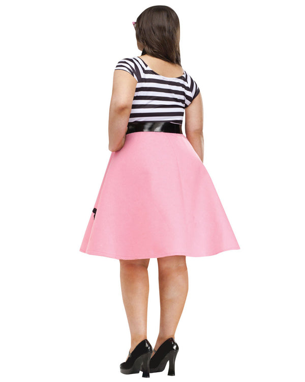This cute pink and black Soda Shop Sweetie Womens Plus Size Costume features a dress designed to look like a separate skirt and top, with a shiny belt and black neck scarf. The 50's style skirt has a little black poodle appliqué for added interest.
