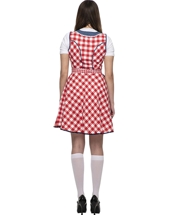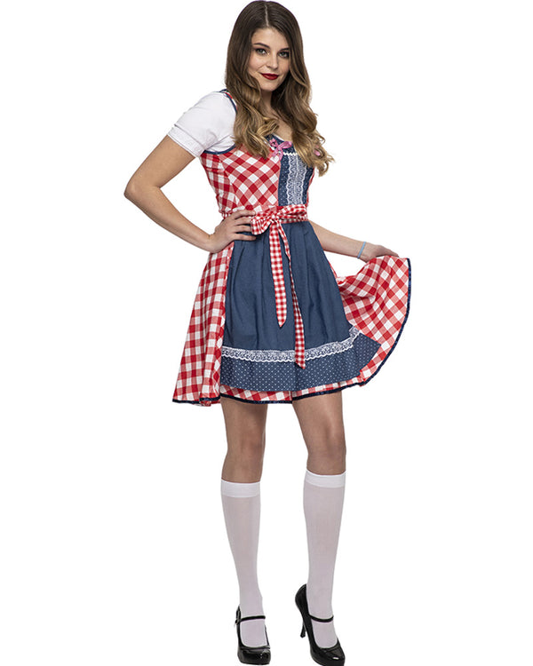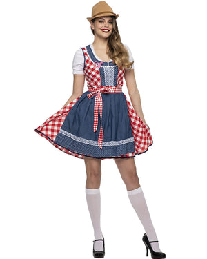 You know you want to become a beautiful barmaid this Oktoberfest so celebrate in style as the local tavern's barmaid in our Sofia Deluxe Oktoberfest Dirndl Womens Costume! This costume comes as a stunning red checkered dress with blue trimming at the neckline and printed blue corset detailing across the bust! Also included with the dress is a white top featuring puffed short sleeves and a love heart neckline for accentuating the bust, as well as a navy blue apron featuring a red and white checkered waist tie with bow detail and a navy patterned hem trimmed in white lace.