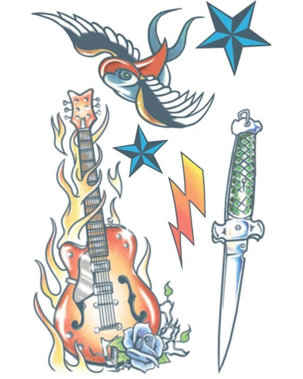 Add the perfect finishing touch to your rocker costume with these great Sold our Souls Rock Star Temporary Tattoos. This great kit includes a guitar with blue rose and flames, blue stars, a swallow, knife and lightning bolt. Cut them out and place them like any temporary tattoo whereever you want.
