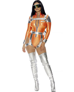 This stunning Space Out Womens Costume will have you ready for any galactic adventure. The costume comes with a metallic orange long-sleeved romper with a zip-up front, embroidered space patches and silver patch detail at the shoulder. The costume also comes with a metallic silver harness to wear over the top, a matching silver garter belt and funky reflective space glasses. Perfect for space themed parties, just add silver boots!