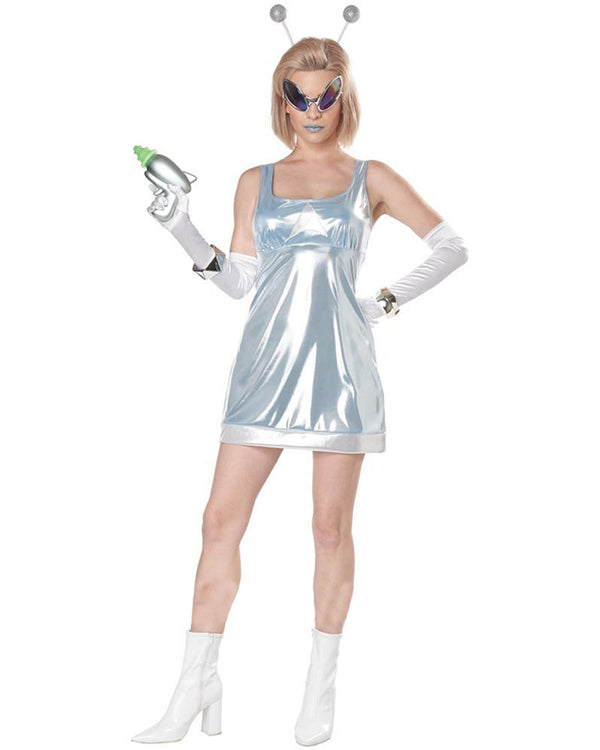 Leave the competition floored with this Space Reunion Mini Dress Womens Costume. This sleek metallic blue sleeveless mini dress with a silver hem will have you feeling like the success you are, or just dazzle the world from the dancefloor. To complete this look slip on your best heels and grab your best friend.