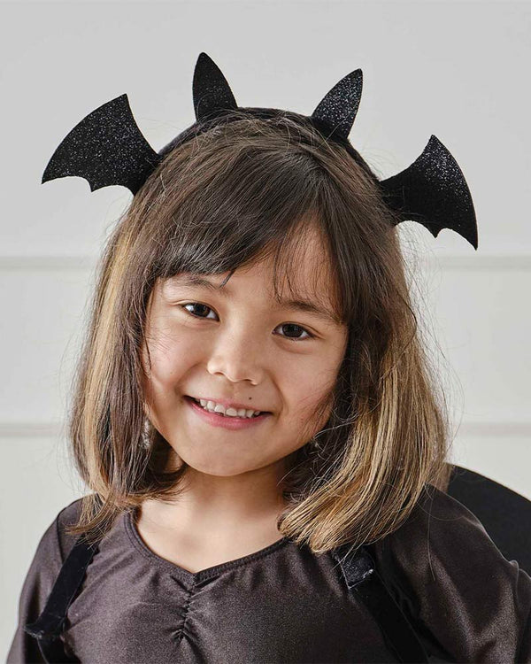 Embrace the enchantment of the darkness with this Black Sparkle Bat Headband. This bewitching headband boasts black glitter bat ears and wings, perfect for girls ready to spread their wings and take flight into the night. Whether they're casting spells as mystical witches or soaring through the night sky as playful bats, this headband adds a touch of fun and flair to any costume ensemble. Pair this headband with matching Fancy Dress Black & Gold accessories or mix and match to create a unique look that's as enchanting as your little one's imagination. Perfect for Halloween, dress up parties and much more.