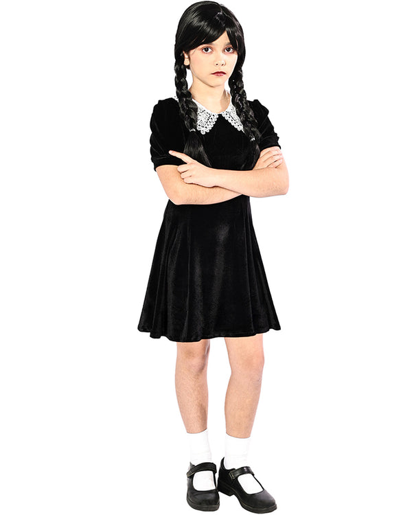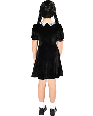 Become everyone's favourite woeful goth in our Spooky Goth Girl Deluxe Kids Costume. The skater-style dress is made from a deluxe black velour fabric and features cute puffed sleeves and a pointed white lace collar. Pair this gothic choice with white ankle socks, and school shoes and either plait your hair or wear a wig to get the perfect mid-week girl look. Halloween never looked so woefully good.