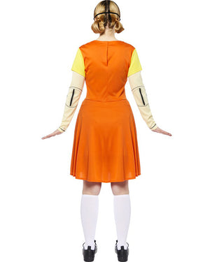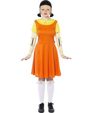 The contestants of the smash Netflix TV show Squid Game won't want to get caught moving by you in this Squid Game Doll Womens Costume. The costume looks just like the creepy doll in the first round of death games in the show and comes with an orange dress with an attached yellow collared T-shirt and attached long sleeves in the style of doll arms, as well as frilly knee-high white socks. To finish off the look, of course, a doll mask is included for an authentic look featuring a doll's face with short brown pigtails. The mask fits across the front of the face only and is secured in place around the back of the head with an elastic strap. Perfect your creepy doll voice saying "Red Light" and "Green Light" for Halloween or Squid Game-themed parties.