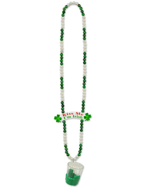 Make sure you're ready for your next drink on St Patrick's Day with this St Patricks Day Banner and Shot Glass Necklace. The necklace features green and white beads with a plastic banner reading 'Kiss me, I'm Irish' and a plastic shot glass.