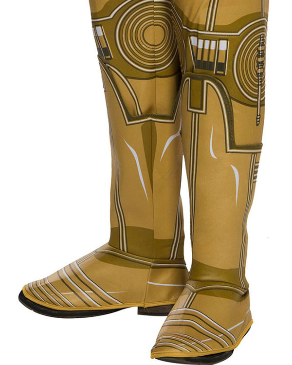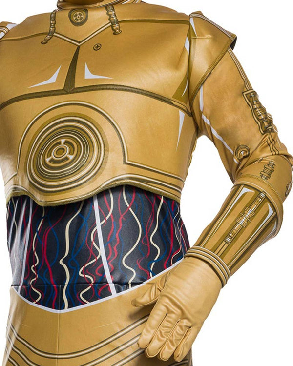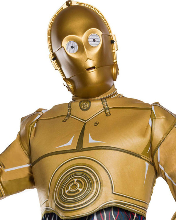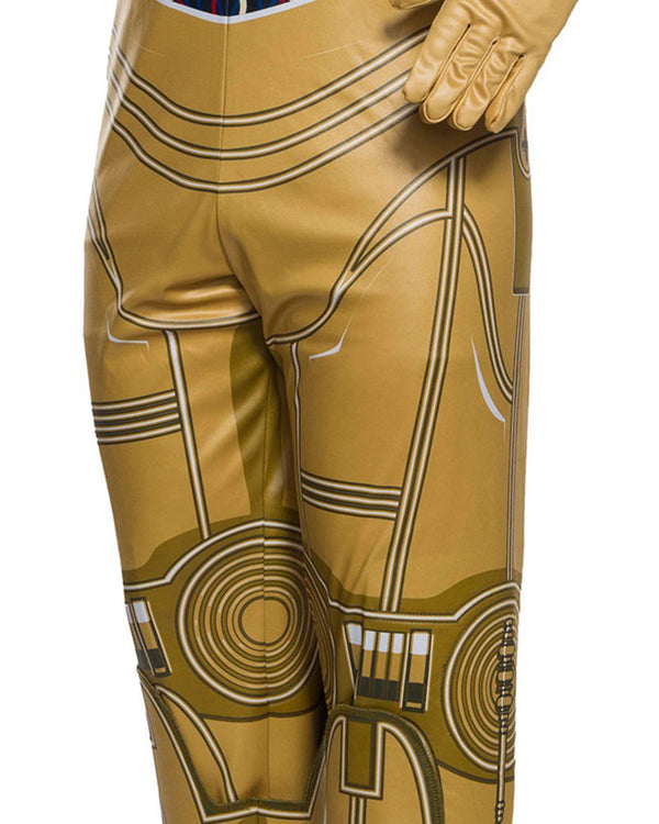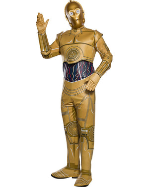 He's known for speaking almost every language and for his trivial knowledge of just about anything, so practice your shuffle for you're going to need it when you wear this Star Wars C3PO Mens Costume. This costume comes complete with a gold jumpsuit with printed detailing of all C3POs fixtures including his midsection exposed red and blue wires and attached foam detailing along chest and sleeves. Includes a gold vinyl half mask of C3POs face and matching gold hood and gloves to help get into character. This is one costume everyone is going to remember at your next Star Wars party.