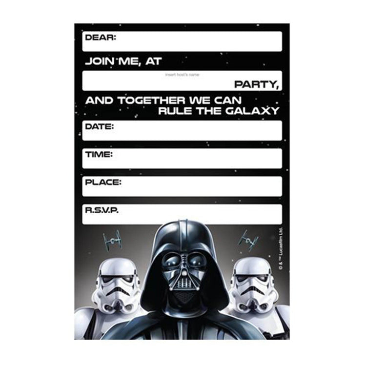 Use the force to summon your friends to your Star Wars party with these Star Wars Classic Invitations Pack of 8. The invitations feature Darth Vader flanked by two Stormtroopers with space for all your party details.