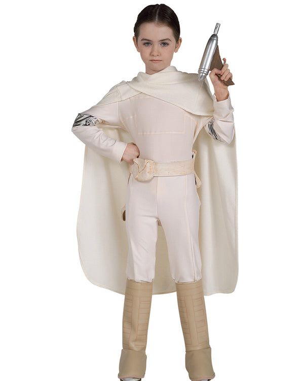 Rescue Anakin from the darkside in this cute Padme Amidala Deluxe Girls costume. This officially licensed Star Wars costume includes a peachy cream jumpsuit (not white/cream as in the photo) with attached boot tops, textured cream shawl and moulded belt. The jumpsuit has pale yellow grid lines on the chest not flesh coloured as in the image. Perfect for defending the galaxy. A bookweek favourite.
