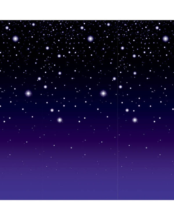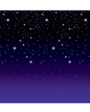 Use this Starry Night Backdrop to create the right party atmosphere. It measures 4' x 30', big enough to cover a substantial part of a wall, is covered in stars on a black/inky blue background.
