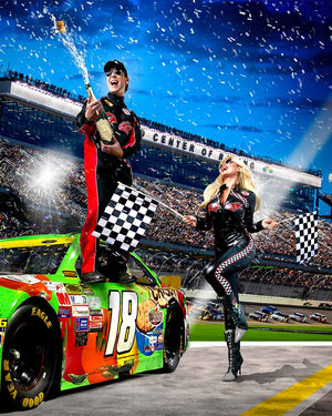 Get hearts racing in our supremely sexy Start Your Engines Womens Costume. This female race car driver costume is a sleek zipper front black jumpsuit with checked sides, racing and flame screen-print details at the wrists and authentic looking race patches along the arms. This also includes a matching black belt. Finish off your costume with a pair of lace up black boots and more fun accessories!