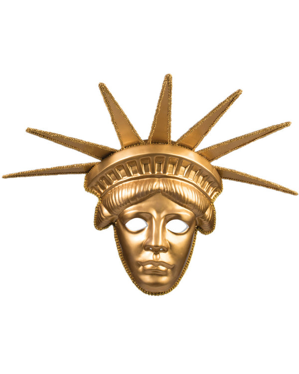 Represent the United States with one of its most iconic landmarks with this Statue Of Liberty Gold Mask. The mask features a golden Statue of Liberty face wearing her iconic seven-pointed crown and features a sparkling gold trim around the edges. The mask has eye holes for visibility, and nose holes for breathing and covers the front of the face and is held in place around the back of the head with an elastic strap for ease of wear. Perfect for 4th of July parties, international-themed parties and more to complete your Statue of Liberty costume.