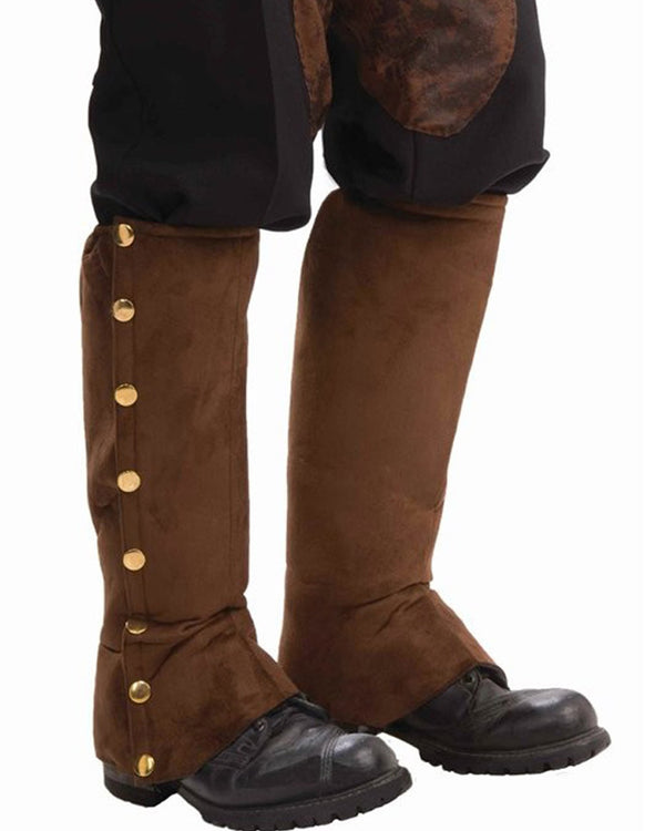 A nice touch to a steampunk outfit, period, military costume, or 19th century man of distinction. This set of brown faux-suede set of spats have gold rivets on them and fit easily over your shoes or boots.