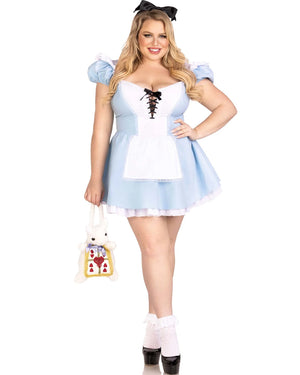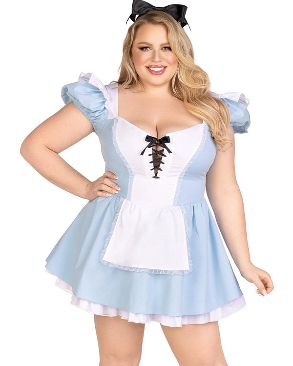 Attended your next tea party in this whimsical Storybook Alice Plus Size Womens Costume. This cute and sexy costume features a light blue mini dress with a playful attached white petticoat that peeks out beneath the hem. The short puff sleeves and dainty mini apron evoke classic charm, while the black ribbon lacing on the bodice adds a flirtatious touch. A large white bow to pin at the back of the dress and a black bow headband complete the look, ensuring you're ready to captivate the curious in true storybook style. Perfect for an adventure in Wonderland or a night of dreamy escapades. Complete with accessories from our Alice in Wonderland range.