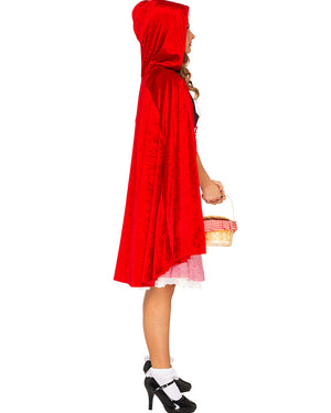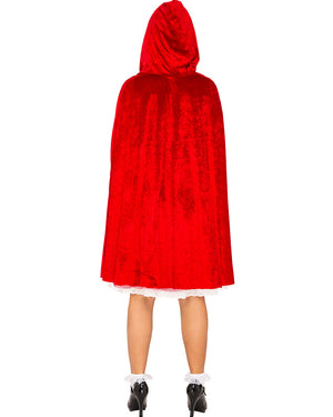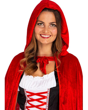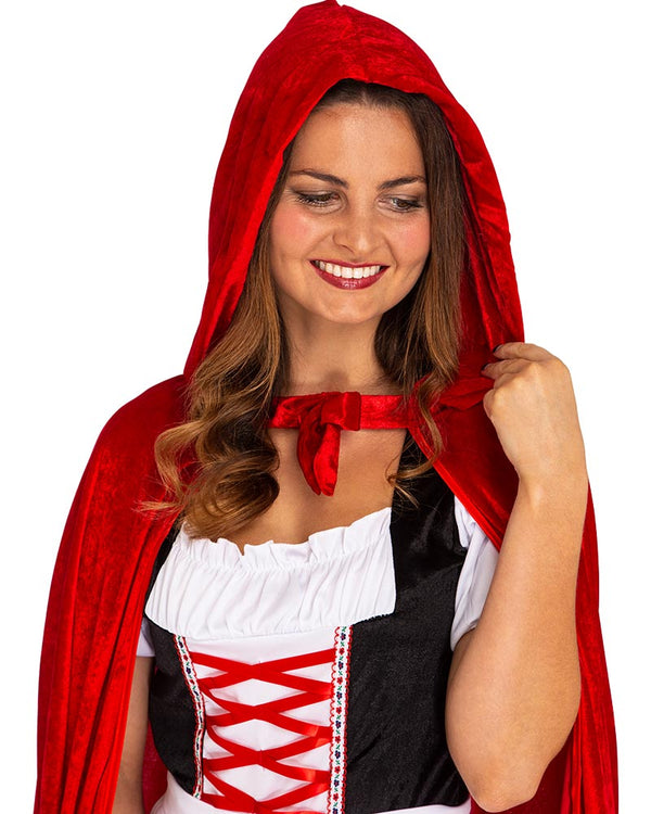 Complete your fairytale costume as you give the finishing touch with the Storybook Red Riding Hood Deluxe Womens Cape. This beautiful over the shoulder red hooded cape with a faux bow is made from velour fabric. Be sure to remember to pack a delicious lunch with you to share with grandma!