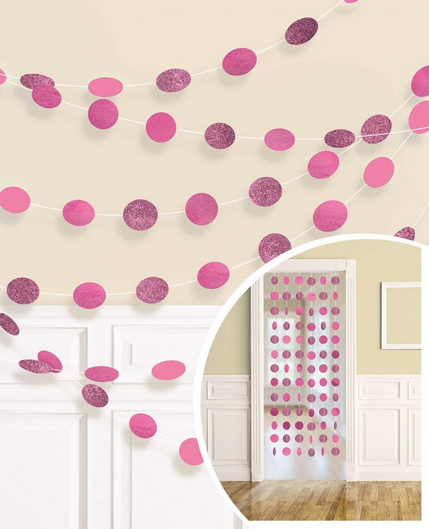 Add some pink glam to your party decorations when you hang this Bright Pink Round String Glitter Decoration Pack of 6. These eye catching decorations will work with just about any party theme you desire and can be either hung in a doorway, entryway or draped across a wall. Decorations come in a pack of 6 and feature round pink double-sided plastic cutouts strung along white string. Half the cutouts are a metallic pink and the other half are pink glitter. Combine with our range of Bright Pink party supplies including party cups, party plates, tablecovers and more.