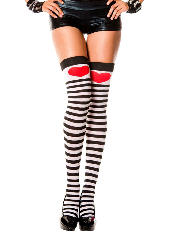 Alice in Wonderland inspired Thigh High Stockings of course. With a seamless white and black stripe design these are topped off with a red heart for that Queen of Hearts touch.