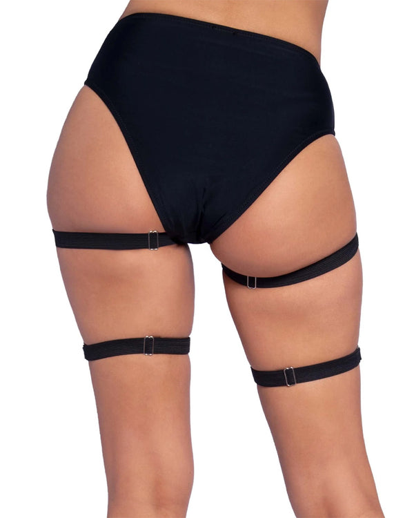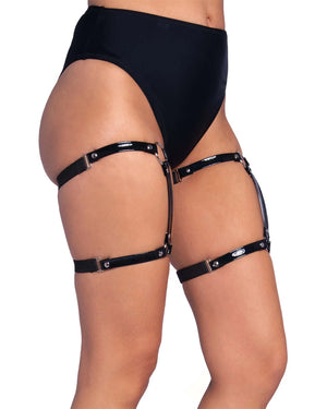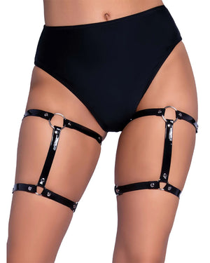 Level up your look and add a sexy, goth touch with these Studded Thigh High Garters. Included is a pair of high-gloss vinyl thigh garters with O-rings and silver stud details. Garters feature an elastic back for a comfortable and versatile fit. These classic, high quality garters will add a sexy edge to any look, from lingerie to rave wear, your next festival outfit, or an adults-only Halloween look. Perfect for adding the finishing touch to a black bodysuit, or style under a miniskirt for a cheeky, dark look that screams ready to party.