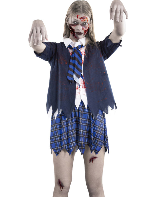 Shuffle through the halls of your school and cause havoc in this Student Zombie Womens Costume. Great for Halloween or your next zombie walk, guaranteed to cause terror. The costume includes an all in one top, which consists of a white tatter shirt, blue tattered cardigan over the top and an attached black and blue striped tie. The shirt and cardigan is covered in blood splatter, your last meal. There is an included short black and blue plaid skirt with a tattered hemline.
