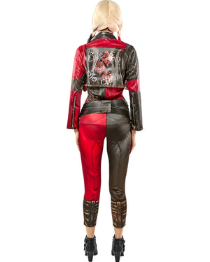Team up with your suicide squad pals and once again save the world wearing this Suicide Squad 2 Harley Quinn Jumpsuit Womens Costume. This rocking costume features a black and red two toned digitally printed jumpsuit with Harley Quinn's iconic diamonds down the sides. The jumpsuit has a sweetheart neckline and thick shoulder straps. The included cropped jacket is waist length and is digitally printed with Harley Quinn's red and black design with 'Live Fast Die Clown' printed around the back. To accessorise, there is an included black printed belt with 'HQ' symbol printed in silver on the front with velcro around the back to keep in place. This costume is based on the outfit worn by Harley Quinn in the action-packed DC film The Suicide Squad.
