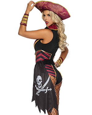 You'll be the centre of attention with our Sultry Swashbuckler Pirate Womens Costume. Featuring a sultry pirate bodysuit styled with a sweetheart neckline, elegant brocade material, red and black stripes, and gold accents. The costume comes complete with a pair of gold wrist cuffs, a pirate hat, and a belt. Great as stunning Halloween costume!